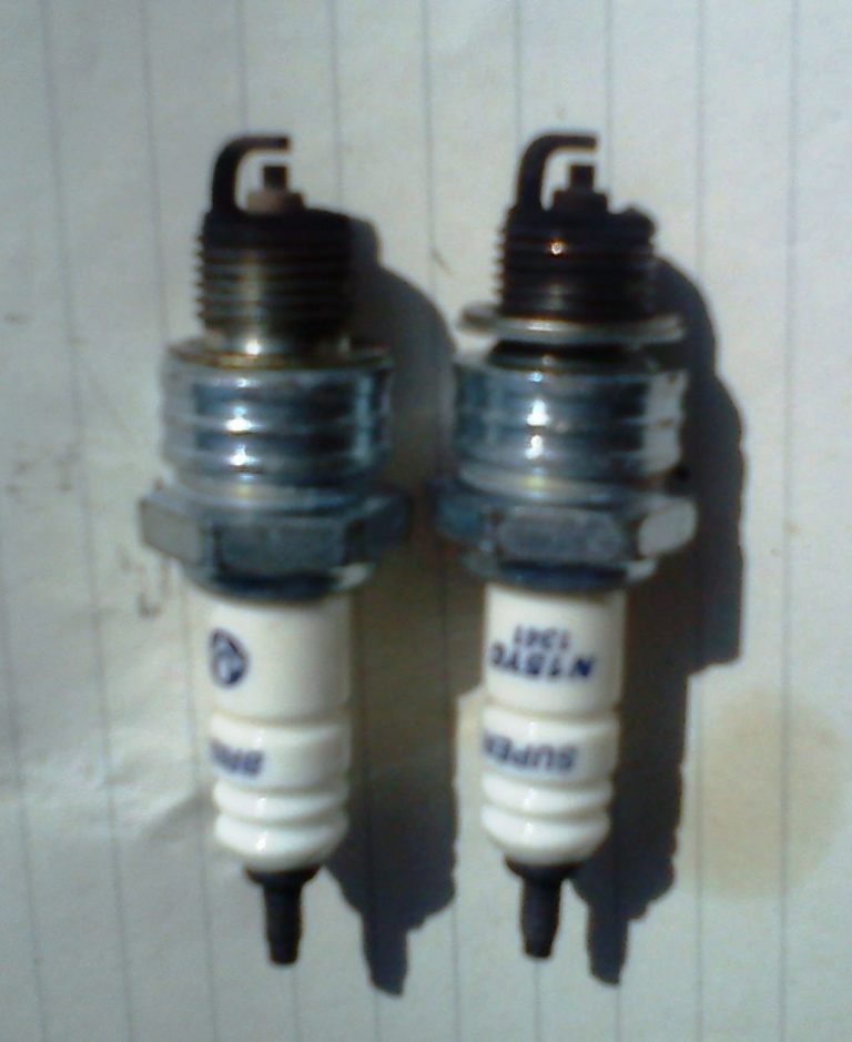 Na obrázku vidíte, že svíčka vlevo je světlá a tím pádem je to chudé a pravá svíčka je šedočerná a to je to správné nastavení karbeců co tomu motoru „chutná“.